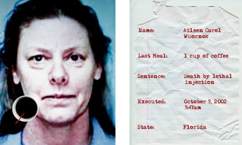 Aileen Wuornos. Seus crimes viraram um filme: “Monster” interpretada por Charlize Theron. Matou sete homens enquanto trabalhava como prostituta, na Flórida. Ela pediu um único copo de café preto para sua ultima refeição.