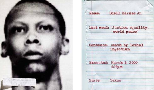 Odell Barnes. Assassinou uma mulher no Texas. Ele não comeu nada, mas pediu “Justiça, igualdade e paz mundial”. Profundo. Acho que ele comeu o papel com o dizer.