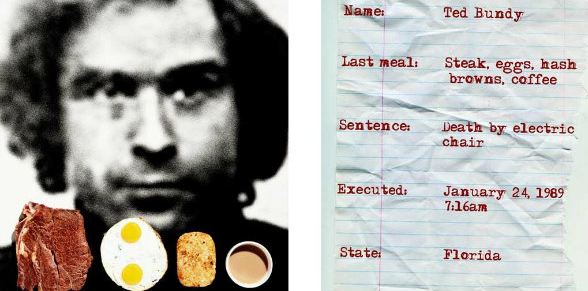 Ted Bundy, que foi morto na cadeira elétrica, em 1989. Este estava com fome mesmo: carne,ovos, batata frita e café pra arrematar.